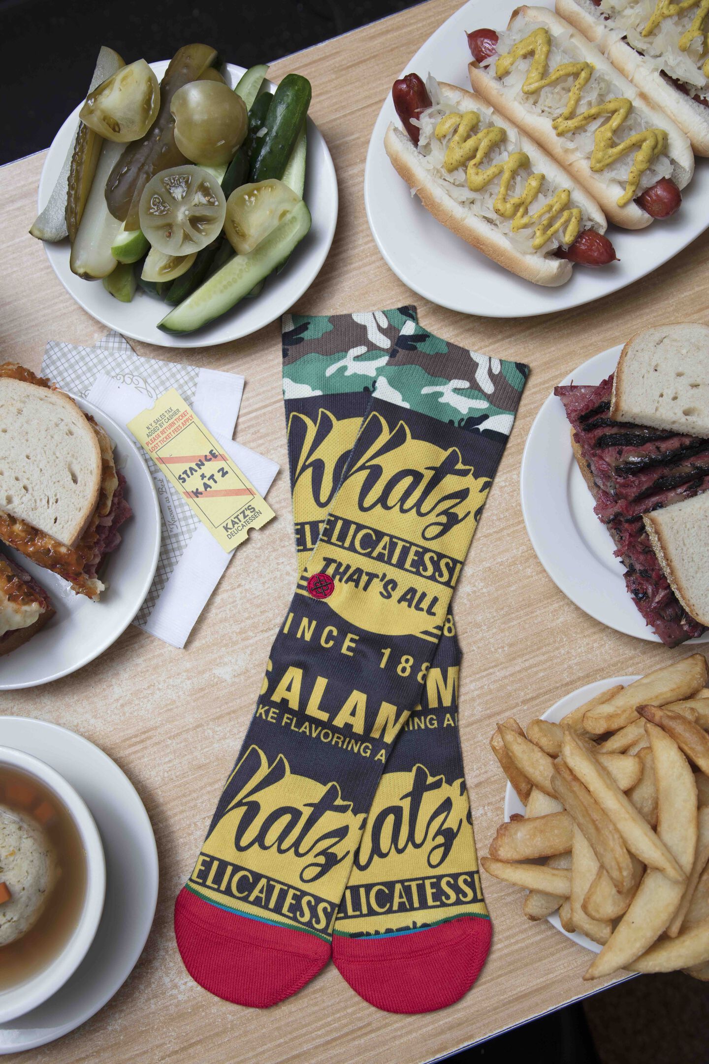 All dinner guests were treated to a luxe, custom-made Stance x Katz’s camo apron, one pair of the exclusive Stance x Katz’s socks, and a custom-made Stance x Katz’s Social Club mustard bottle. The event drew several NYC influencers, including sneaker moguls Ronnie Fieg, Yu-Ming Wu, and Wendy Lam, as well as artists Neckface, B. Thom Stevenson, Stretch Armstrong, and BJ Betts, among many others.This special collaboration with Katz’s includes two limited-edition socks, reminiscent of iconic items found within, or made famous by, the deli. The first takes cue from their nostalgic ticketing system, an item every patron receives upon entering the restaurant. The second is designed with camouflage and inspired by their slogan derived from a family tradition of sending food to their sons in the armed forces: “Send a Salami to Your Boy in the Army.”
