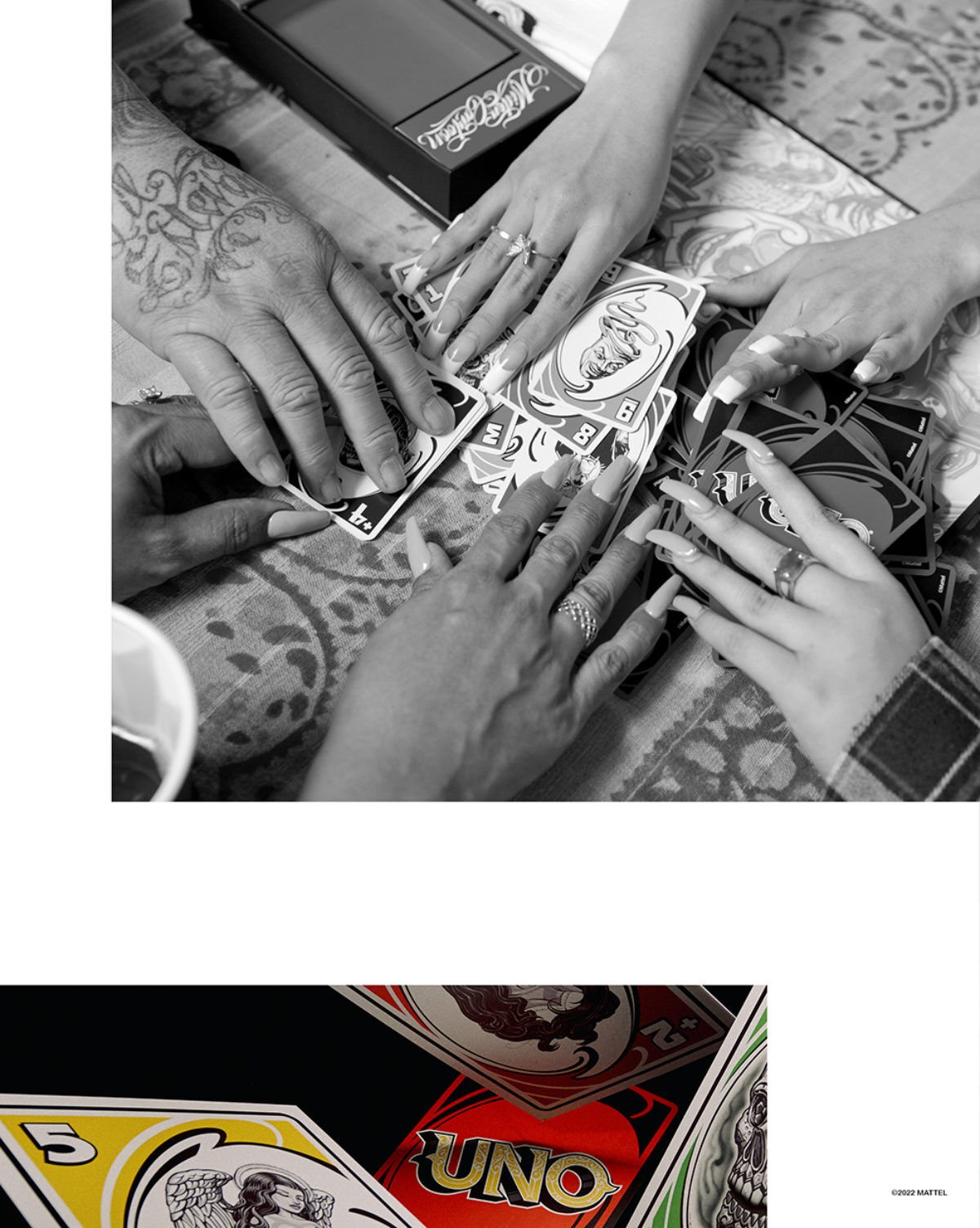 The collaboration also features box sets that come with Cartoon’s famous tattoo flash illustrations on every card in the UNO card set. The collection also features a cotton t-shirt, and hoody highlighting the artist illustration of the games Wild card, Cartoon style.